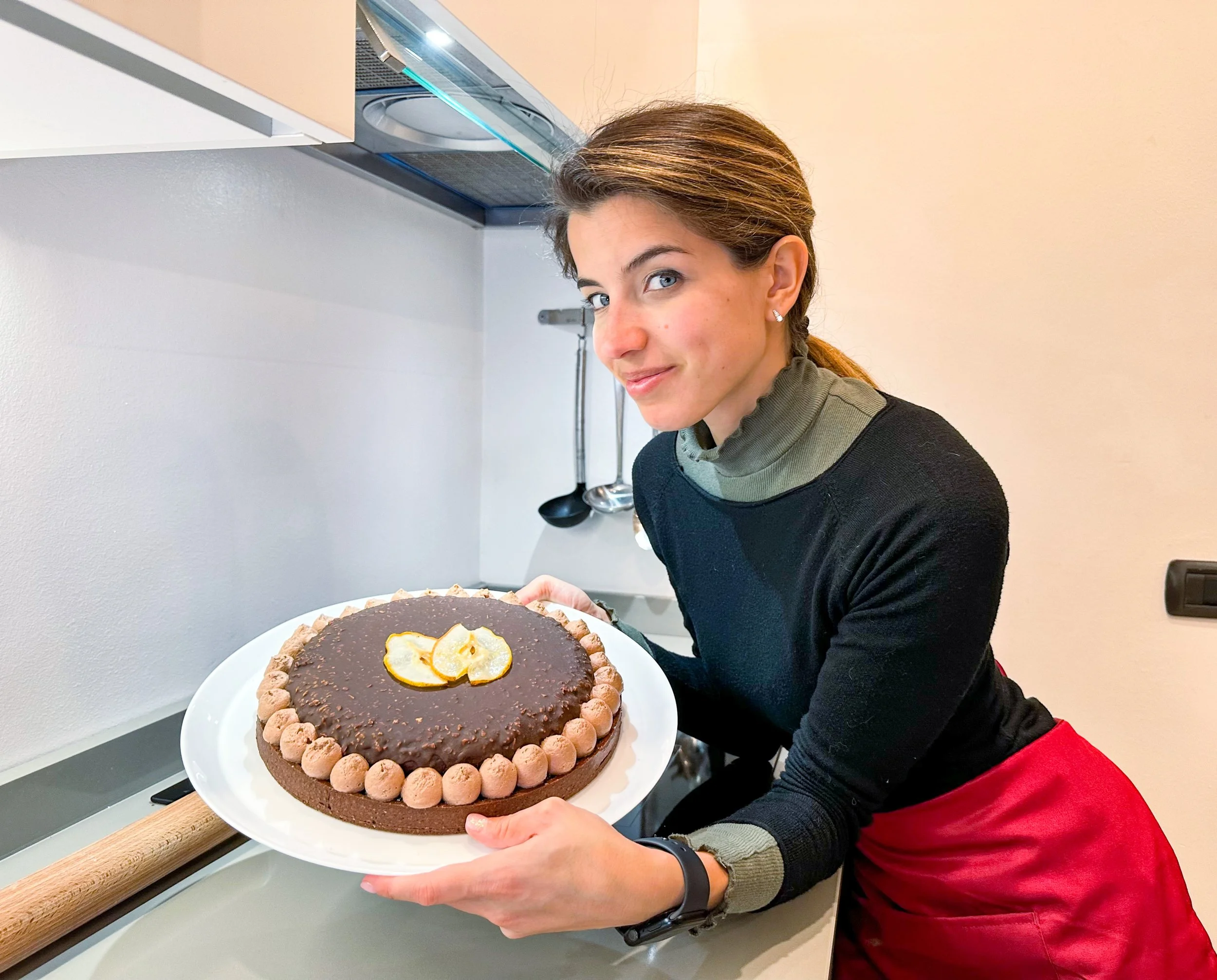 Una base di frolla sablée alle nocciole e cacao con all’interno un disco di dacquoise alle nocciole e uno strato di confettura alle pere. Sopra una bavarese al cioccolato fondente con copertura di glassa rocher e ciuffetti di crema montata alla ricotta e cioccolato gianduia.