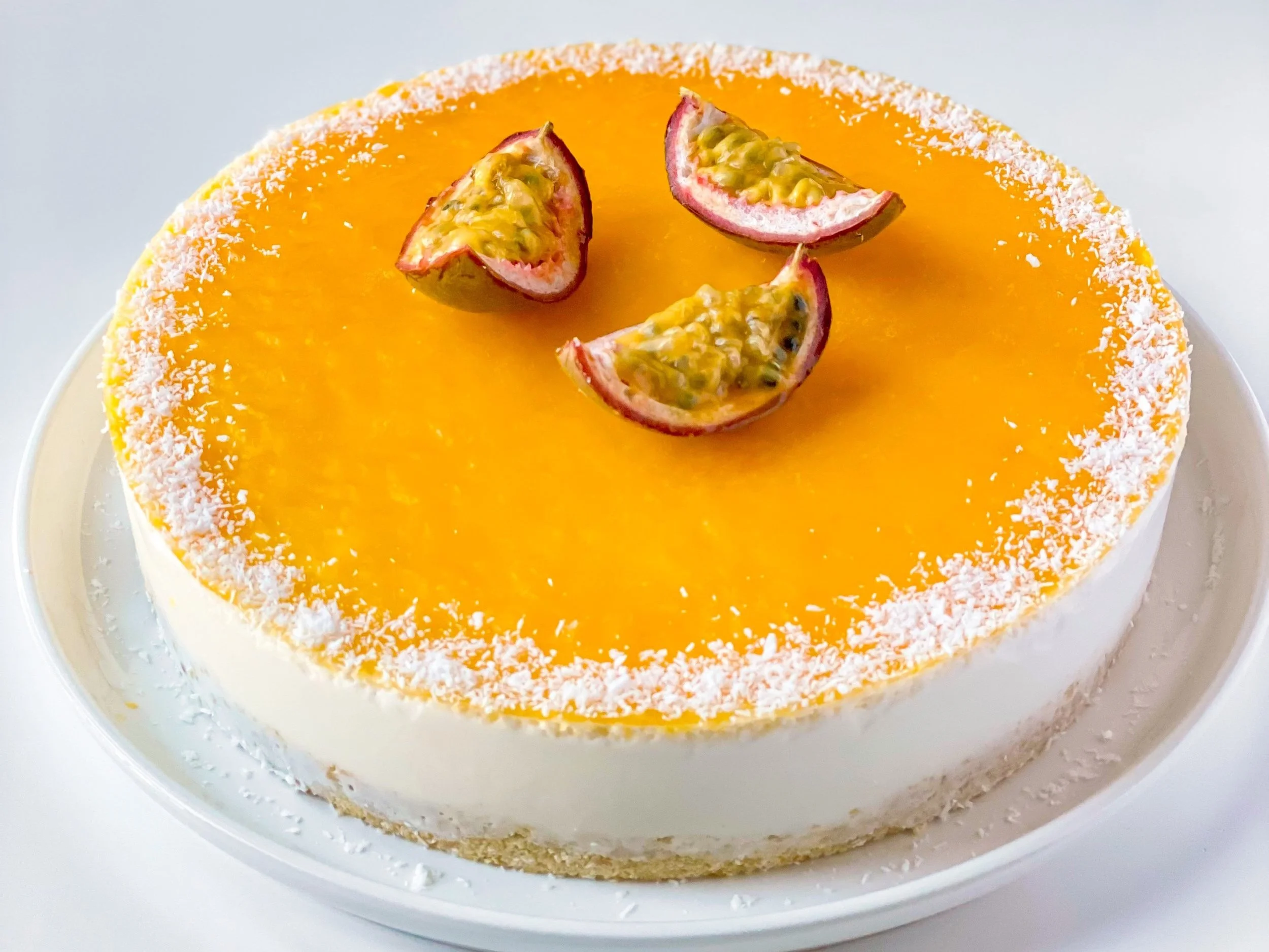 Cheesecake con base di biscotti digestive, ripieno al cocco e gelée al frutto della passione in copertura.